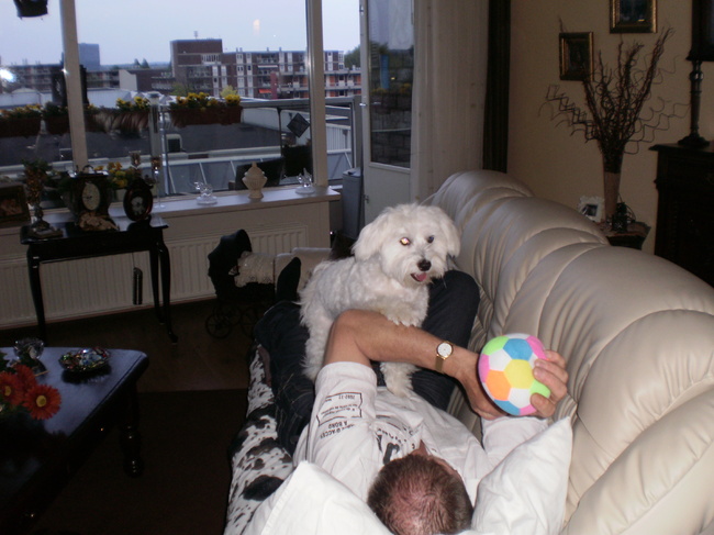 Honden foto's > Anita.Langen. > Kom net terug van de trimmer. Maar voor ik ga slapen eerst stoeien met de baas.