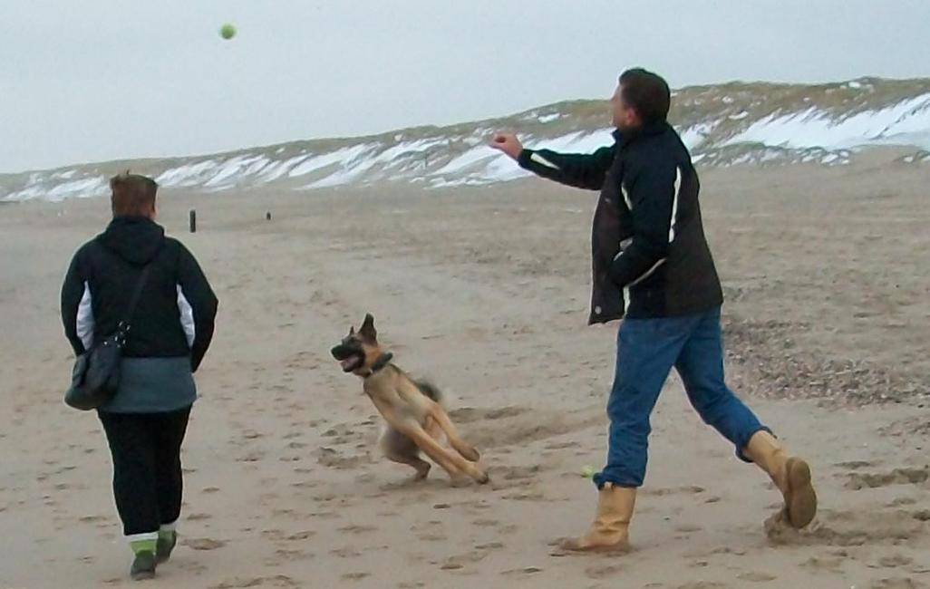 Honden foto's > Arie > Naar het strand en met tennisballetjes spelen. Beter kan ik me niet vermaken........