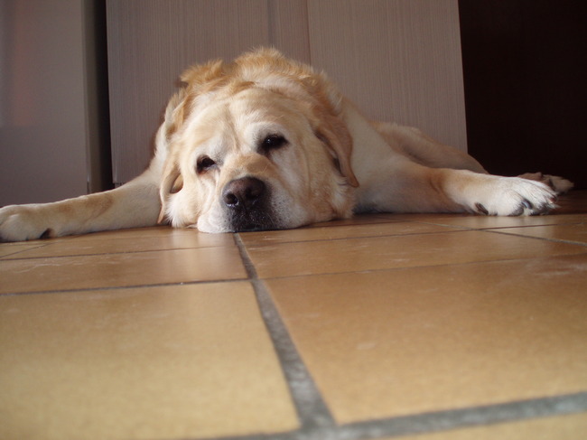 Honden foto's > Lydia en Yago > Op vacantie, wat was het lekker koel op de vloer!
