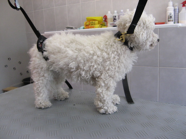Honden foto's > Annick Baeten > Gucci, Bichon Frisé komt haar krulletjes laten uitkammen.