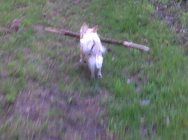Honden foto's > Denise, Benji & Hogy. > ik ben klein, maar vind hele grote stokken heel leuk!