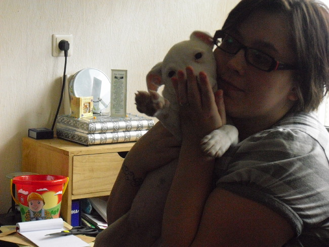 Honden foto's > Janneke , Milo & Lola > Even knuffelen met het vrouwtje. Ze was toen net voor de eerste keer bij ons thuis