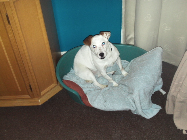 Honden foto's > Janneke , Milo & Lola > Mijn lieve Milo in zijn mandje...