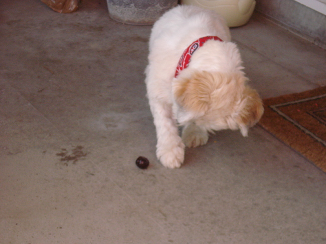 Honden foto's > Son > Spelen met een kers...Oh ??? ...die kun je ook eten ?????