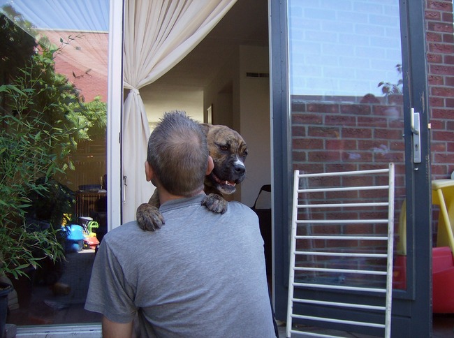 Honden foto's > Esther&beertje > zie je me vrouwtje ik knuffel baasje.