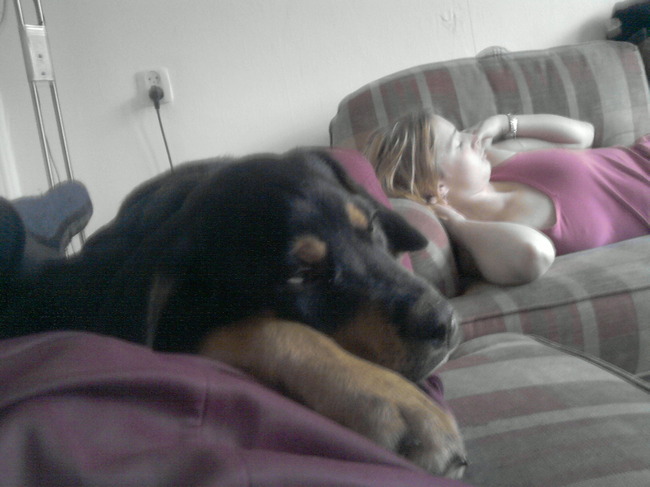 Honden foto's > Roxy , Bonky en Daisy > Lekker lui liggen met baasje en vrouwtje. Wat is die broek van baasje lekker zacht