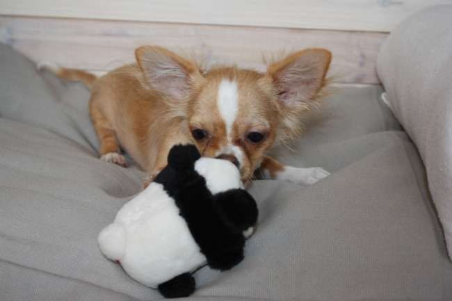 Honden foto's > Joyce&Jay > Jay op ze bedje met Pandabeertje