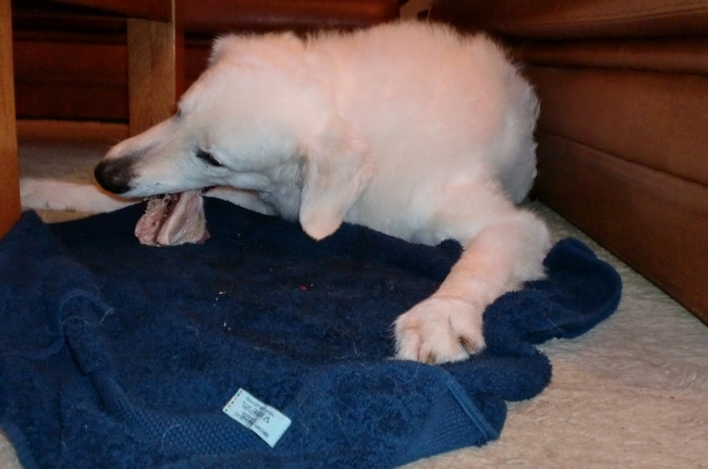 Honden foto's > Annelies & Déru†, en de Puli,s Ixy en Kwint > Déru barft!! Een heerlijke kippenpoot!