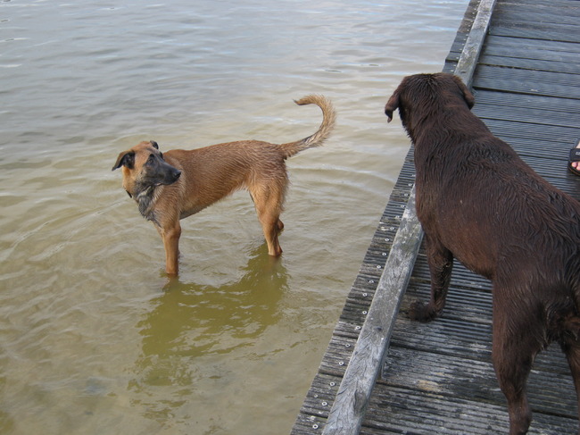 Honden foto's > Fiona en Rossi > Rossi checkt op hoogte eens even waar Luna de bal heeft gelaten!