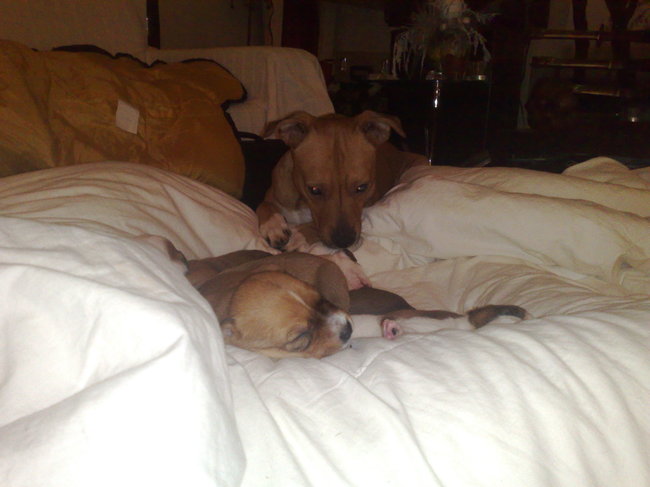 Honden foto's > Beau > Jari voor het eerst kijken bij de pups (15 dagen oud)