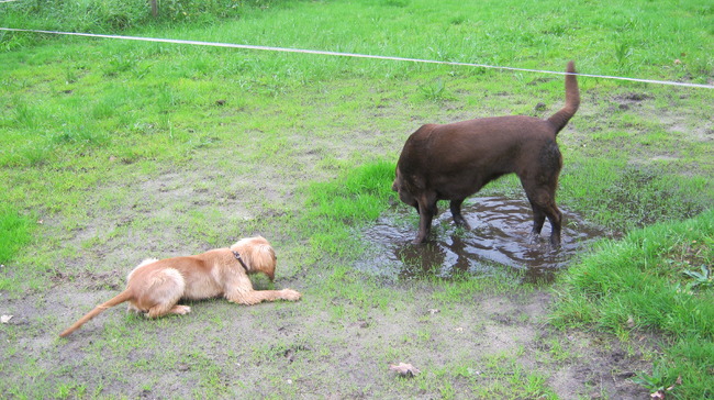 Mo & Xena bij een plas water in de wei van Natalie & Mo