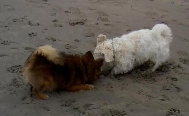 Honden foto's > Dominique en Gucci > Heerlijk, de honden mogen weer op het strand!