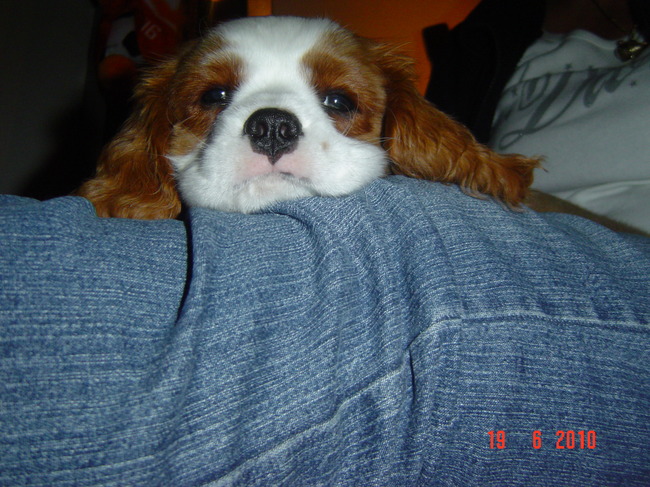 Honden foto's > leony met Binky > Bij vrouwtje op schoot