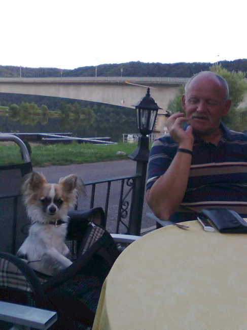 Honden foto's > Henri > Baasje en Max op terrasje in Piesport