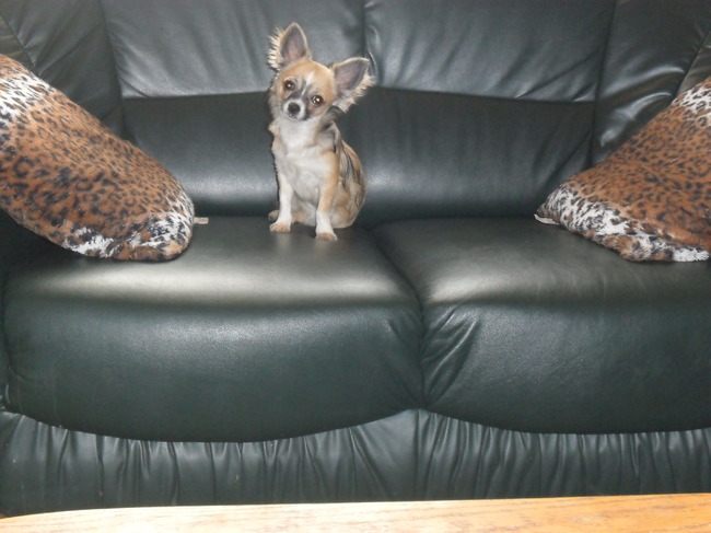 Honden foto's > isabell en mizka en zino > hier zit ik lekker in zetel en wat hoor ik daar en zie ik