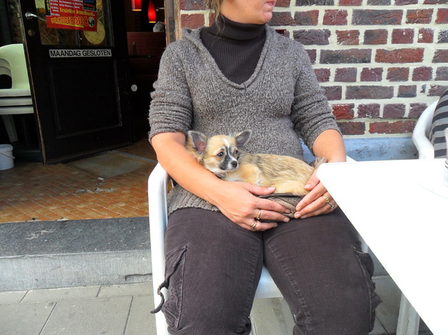 > lekker op schoot bij vrouwtje we waren toen die dag in scherpenheuvel hebben we genoten van het weer en een terasje en ook mizka kreeg drinken en lekker koekje van de garzon