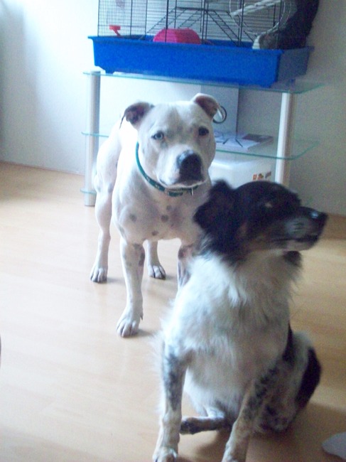 Honden foto's > Claudia, Andor en Deamon > Ghenghis luisterd aandachtig naar Melissa, Andor heeft kriebels hihi.