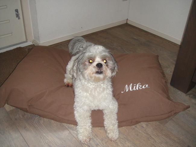 Honden foto's > Dineke > Mika op zijn mooie, nieuwe kussen