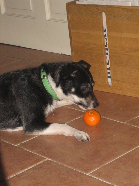 Honden foto's > Kimberley > Nina vond een manderijntje liggen en dacht dat t een leuk speeltje kon zijn