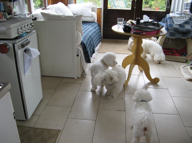 > Doedel snuffelt bij pa, zijn moeder staat bij de bench en oma (moeder van zijn vader) staat met haar achterwerk naar de camera