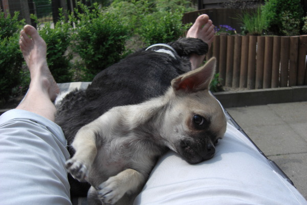zo slaapt onze kleine bo'tje( 8weekjes) graag haha, ze weet nu al wat ze fijn vind.. slapen te diep in slaap om te merken dat ik val Dobby met vampier tandjes praat je tegen mij?