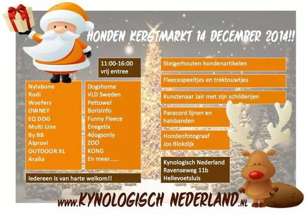 Beschrijving: A.s. zondag 14 december organiseert Kynologisch Nederland een kerstmarkt waar baas en hond welkom zijn.