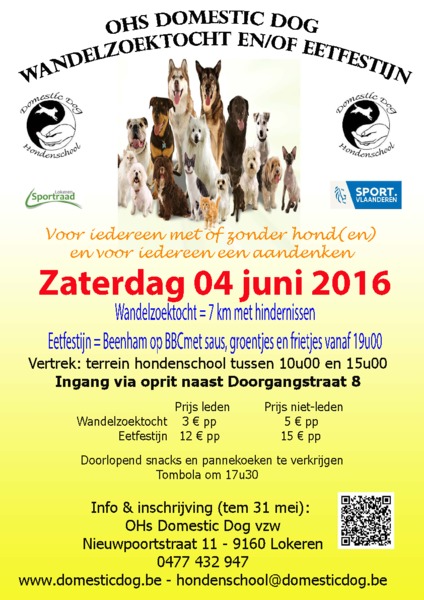 | Beschrijving: | Onafhankelijke Hondenschool Domestic Dog is weer toe aan haar jaarlijkse hondenwandeling. De wandeling is een zoektocht met hindernissen over een afstand van 7 km, die vrij kan gestart worden tussen 10u00 en 15u00. Voor iedereen met of zonder hond(en) is er terug een aandenken, snacks en drank zijn te verkrijgen. De tombola gaat door om 17u30 en altijd prijs. Tenslotte het eetfestijn om 19u00 met beenham op de BBQ. Inschrijven kan tem 31 mei via http://www.domesticdog.be/Inschrijving/wandelzoektocht.html Voor bijkomende informatie kan u terecht op [email protected] Tot zaterdag 04 juni 2016 |