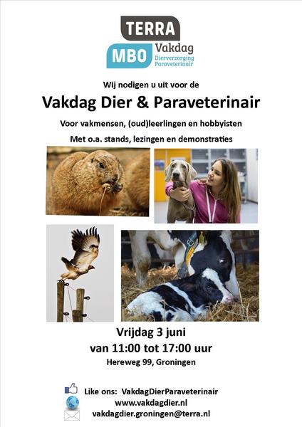| Beschrijving: | De Vakdag Dier & Paraveterinair wordt dit jaar voor de derde keer georganiseerd. Het idee voor de vakdag in Groningen is ontstaan, doordat veel vakdagen en bijscholingen in deze sector plaatsvinden in het midden en Zuiden van het land. Het is daarom de bedoeling deze vakdag jaarlijks te organiseren. Dit jaar ligt de organisatie weer in handen van leerlingen Dierverzorging van Terra MBO Groningen, als onderdeel van hun examen. De vakdag bij Terra MBO Groningen wordt gevuld met diverse lezingen en demonstraties, bedoeld voor vakmensen, (oud)leerlingen en hobbyisten. Tussen de lezingen en demonstraties door hebben de bezoekers de mogelijkheid de beursvloer te bezoeken, waar verschillende bedrijven hun producten en diensten laten zien. Dus kom op vrijdag 3 juni tussen 11:00 en 17:00 uur naar de Hereweg 99 in Groningen. |