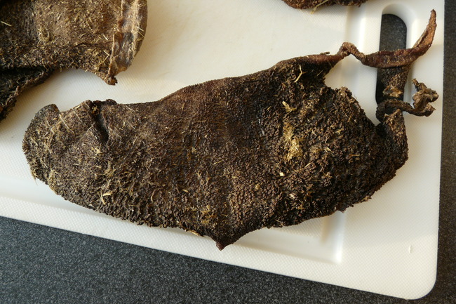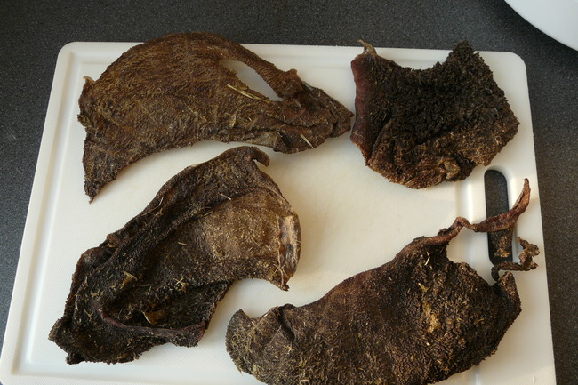 Het jammere van zulke gedroogde penslappen geven vind ik dan weer dat het zo lijkt op de pens die ze hier eens per week vers krijgen. gemiddeld genomen krijgen ze dan over de week best veel pens lijkt me. En dunnere ontlasting.
