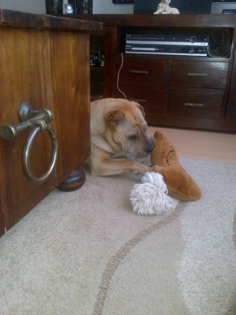 Een knuffelbeer waar alleen het omhulsel nog maar van bestaat en een hoofdkussen zijn ,zijn favorieten. Daar loopt hij heel veel mee rond te sjouwen. En natuurlijk daagt hij daar Shyra ook mee uit om er aan te trekken. En als dat lukt kunnen ze daar echt een hele poos samen zoet mee zijn.