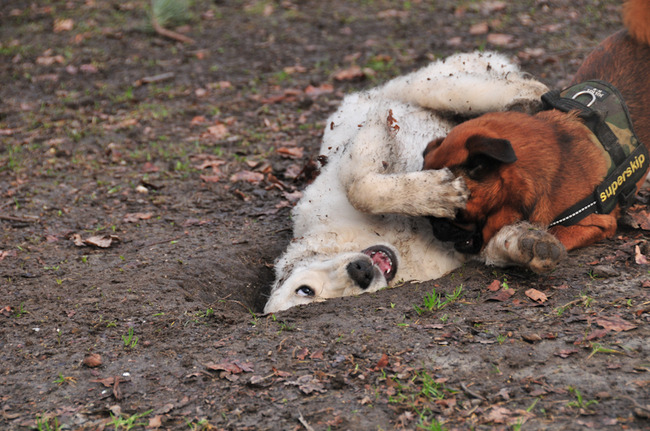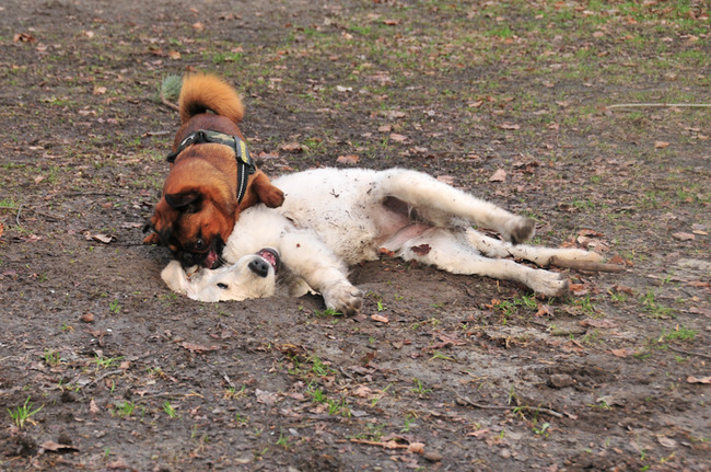 Maar ook de andere honden zijn gewoon leuk. Natuurlijk willen ze niet allemaal spelen, maar dat laten ze dan even weten en dan is het klaar. Er is wel een oude herder, een voormalig fokteef, die heel erg de neiging heeft zich ermee te bemoeien als de jongere honden spelen. Ze gaat ze dan op de plaats zetten om de rust te bewaren. Vind haar baasje ook vervelend. Eerder deze week zijn we bewust wat langer bij elkaar blijven staan, ook op verzoek van het baasje, en mama herder werd steeds rustiger. Gisteren kwamen we ze weer tegen, en toen werd het spelende duo eigenlijk genegeerd. Weer een positieve ervaring voor allemaal dus.