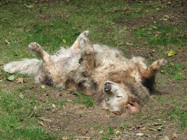 Hond die rolt in de modder