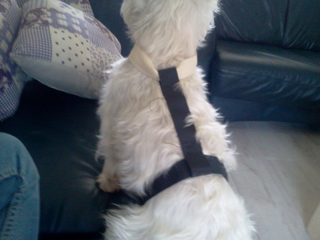Hij vind wel lekker ziitten (hij tuigjs gewend) alleen op de foto lijkt het op hij te strak zit maar dat is niet