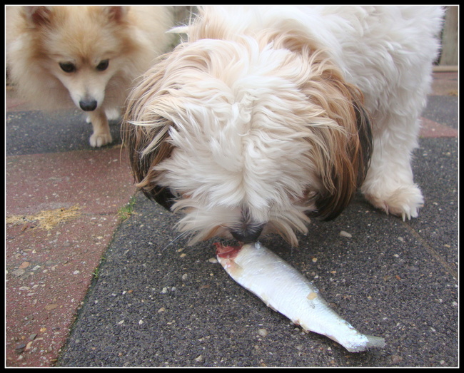 Vannochtend hebben ze alle drie een haring op, Sammy vond het deze keer niet zo geslaagd geloof ik, hij at de kop en nog een stukje en liet hem daarna liggen , af en toe er aan trekken.. Hij vond hem mss te koud omdat het zo uit de koelkast kwam.. Volgende keer maar een poos uit de koelkast houden voor hem.. voor hem heb ik het vervolges in stukjes moeten snijden en toen heeft hij het metlange tanden opgegeten, vreemd want vorige week at hij het met smaak.. Voor het eerst dat hij iets niet echt wil eten.. Even kijken wat hij volgende week met de haring doet en anders maar iets anders geven de volgende keer..