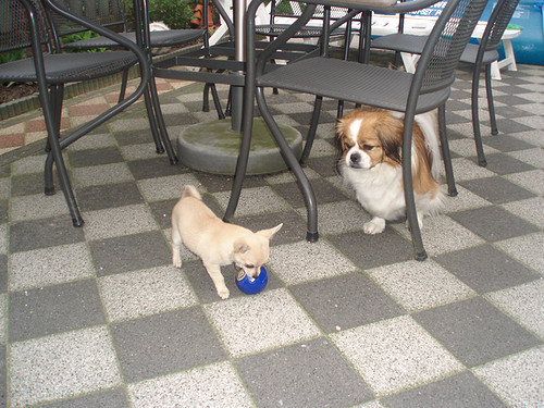 Hier zie je een foto van Bailey en Sophie toen bailey denk ik 3-4 maanden oud was. Dit is trouwens hun tuin die helemaal dicht is dus waar ze lekker in kan spelen.