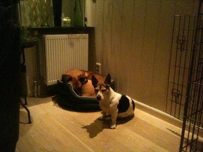 eerst is in die mand 3x de ene kant op draaien dan 3x de andere kant opdraaien, dan vrouwtje hulpeloos aan kijken, van het past niet, zo heeft ze 5 minuten gestaan totdat we haar geroepen hebben, daarna hebben de hondjes heerlijk naast elkaar op de bank gelegen (haha tja ze moeten toch wat he?)