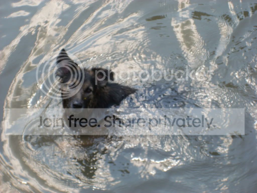 Ik vond zwemmen eerst héél erg eng. Ik ben 1 x in de singel gevallen, gelukkig trok het Mens mij eruit, zat helemaal onder het kroos. Dus ik dacht eerst "knappe jongen die míj daar ooit nog in krijgt". Maar vorige zomer gingen we met mijn roedel naar het park en toen ging Mischa-mens er zelf eerst in. Het Andere Mens stond op de kant, gooide balletjes naar Mischa toe en ze moedigden mij'heél erg aan. Daar ben ik sowieso heel gevoelig voor, dus heb ik me er maar overheen gezet. Die foto's hierboven, van Ben met de bal en mij, dat is de eerste keer zwemmen voor mij geweest.