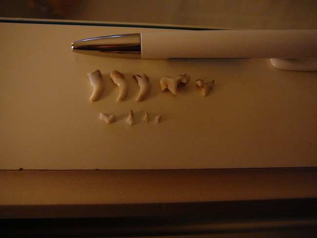 Ik heb van Shadow een voortand (wou even voelen hoe los die zat en toen had ik hem opeens in mijn hand), 2 hoektanden en een kies