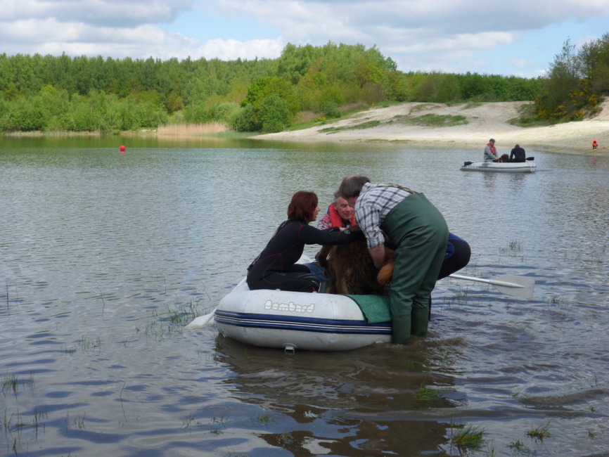 ik zat in de boot, en bamse moest naar me toe zwemmen, mmmm het ging, maar ze vond het allemaal maar raar, ik in de boot met een oranje reddingsvest om, hahahaha