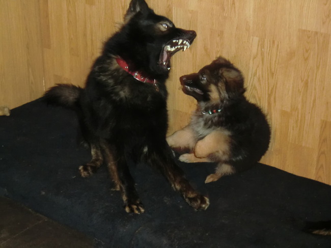 Heel duidelijk dat de volwassen hond niet weet wat ze met de pup moet, hij reageert niet op de signalen die hij af geeft, dus zit er maar 1 ding op, happen.