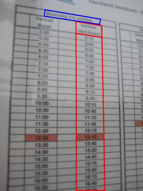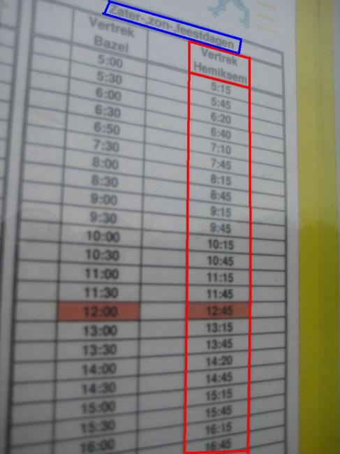 Het rood omkaderde zijn de uren van vertrek in Hemiksem!