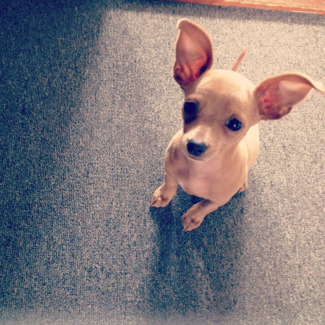 vind dat kleine honden altijd in verhouding met hun koppie, hele grote oren hebben, eerst komen de oortjes de hoek om en dan de hond.