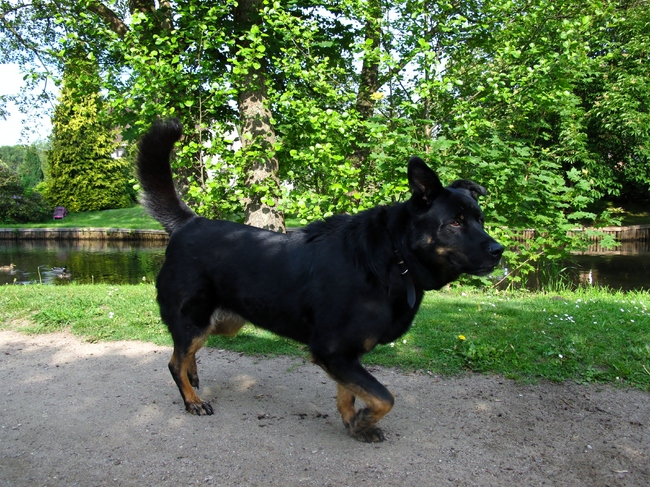 Hieronder een hond die we voor het eerst ontmoetten, beide honden hebben elkaar voorzichtig in een flink boogje benaderd, doen quasi ongeintresseerd, om de situatie te ontspannen, daarna snuffelden ze even aan elkaars kont en we liepen gewoon verder.