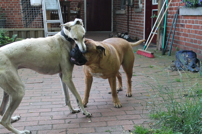 Ali is echt een ondeugende draak, maar Lo kan zoveel van hem hebben. Galgo's hebben een heel teer huidje, een wondje zit er zo. Maar onze Lo doet zo voorzichtig, hij heeft nog geen krasje. Gelukkig kan een Bullmastiff het een en ander verdragen want andersom gaat het niet altijd zo zachtzinnig.