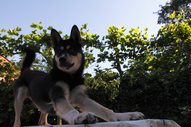 Maar stoelen zijn ook best comfortabel hoor... (dit is Chenak, onze eerste husky die ons leerde dat hussen ergens op moeten kunnen liggen... )