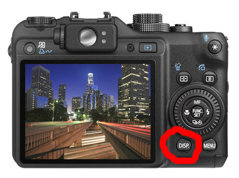 Ik weet niet of het knopje "DISP." op je camera zit? Op de mijne wel (zoals je ziet op de foto). Als je daarop drukt, wat gebeurt er dan?