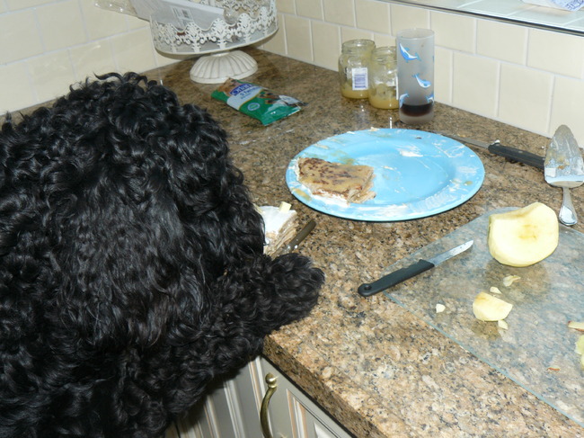het smaakte goed dus buddy besloot het restje taart van het aanrecht af te pikken
