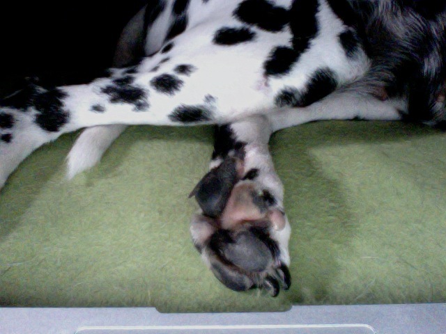 Ik zie net bij Perdie dat ze aan haar achterste kussentje een los velletje heeft hangen. Het lijkt geen pijn te doen en onder het velletje zit gewoon een mooi 'nieuw' zwart kussentje. Ik vind het toch maar raar aangezien het de 1ste keer is dat ik dit zie