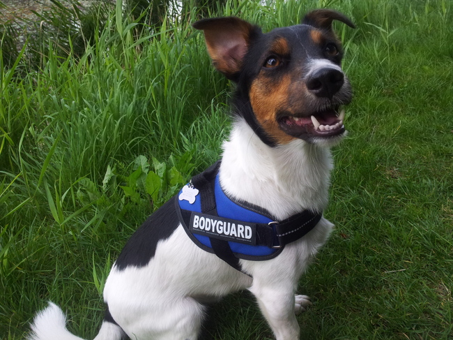 Igor heeft een hele stoere versie en hij heeft verschillende labels o.a. rescue en security. Grappig dat mensen heel vaak denken dat hij een "echte" rescuehond is die heel serieus benaderd moet worden!
