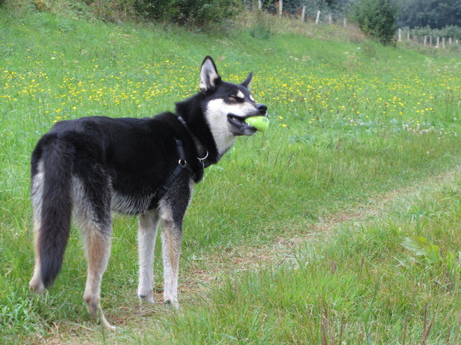 Eindelijk koeler! De mannen hebben dan meteen ook weer extra energie. Zaterdag was Shadow aan de beurt: 's ochtends vroeg een stukkie fietsen. Die hond moet mij wel knettergek vinden want dan zit er een jong konijn dat niet wegloopt, gaat ze remmen?? Terug via de boomgaard en de gok maar gewaagd. Ik had het geheime wapen bij me, Shadows piepbal en ik heb hem los gelaten. Het ging prima, hij moest tussen alle rijen bomen even checken wat er gebeurde maar kwam steeds weer naar mij toe racen. Een keer de piep gebruikt toen hij wel erg ver voor mij uitliep en dat werkte perfect.